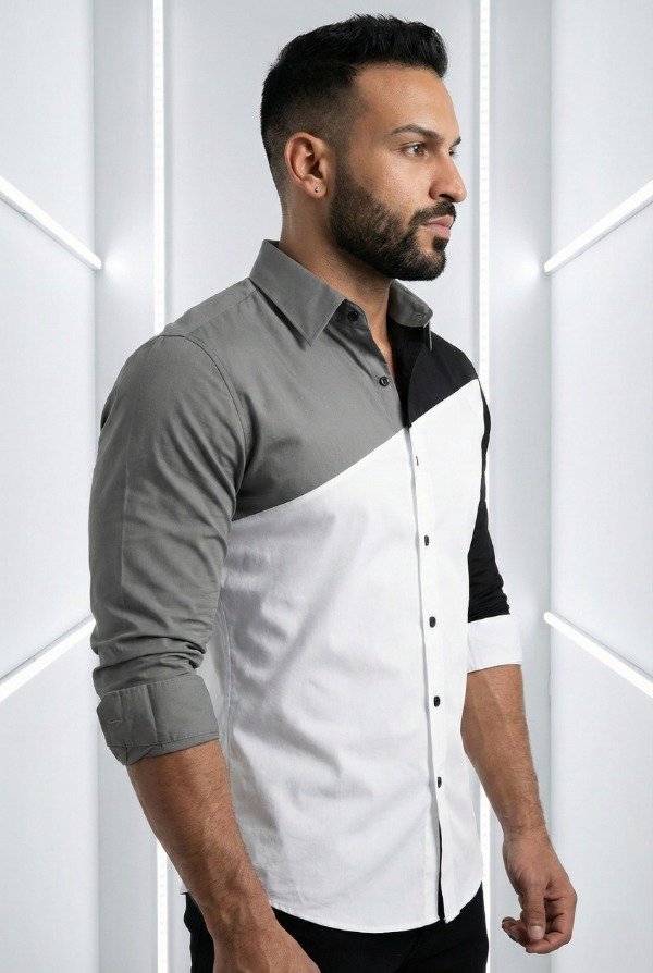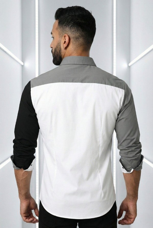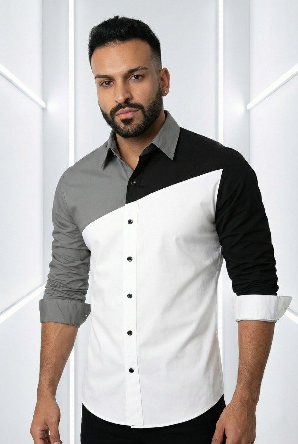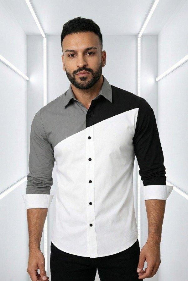 Camisa de diseño moderno y sofisticado, confeccionada con un impactante juego de bloques de color en blanco, gris y negro que crean una composición geométrica elegante y vanguardista. Su corte recto estiliza la silueta, aportando una presencia limpia y masculina, ideal para quienes buscan diferenciarse con una prenda de carácter.