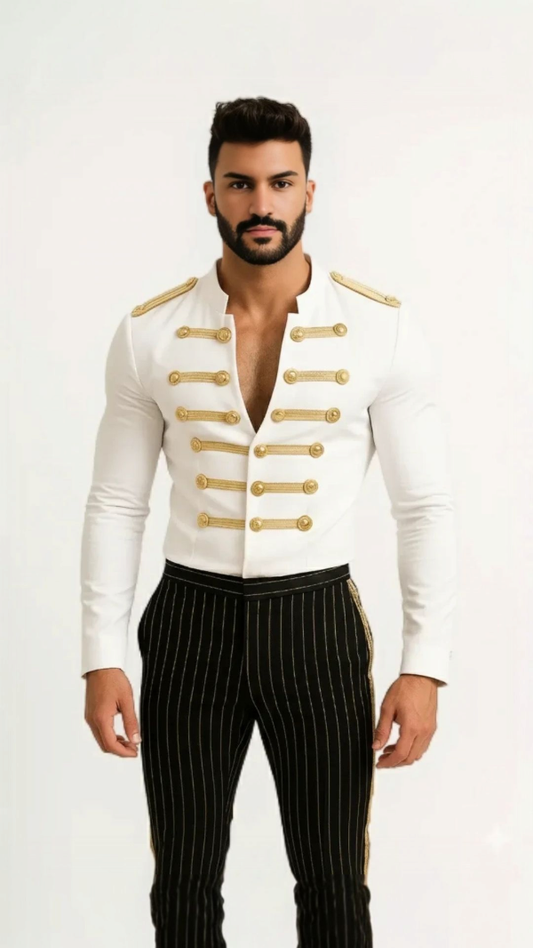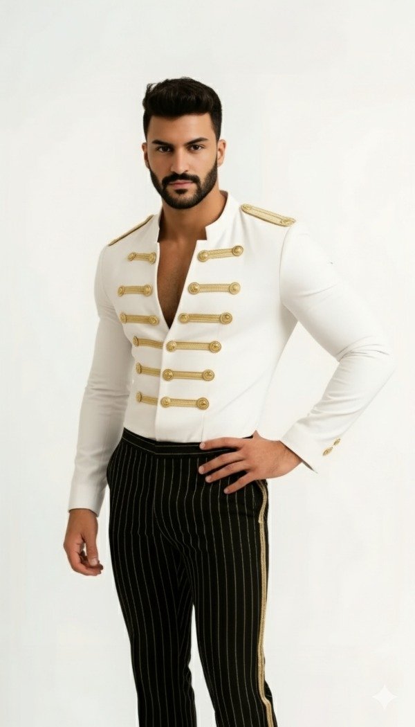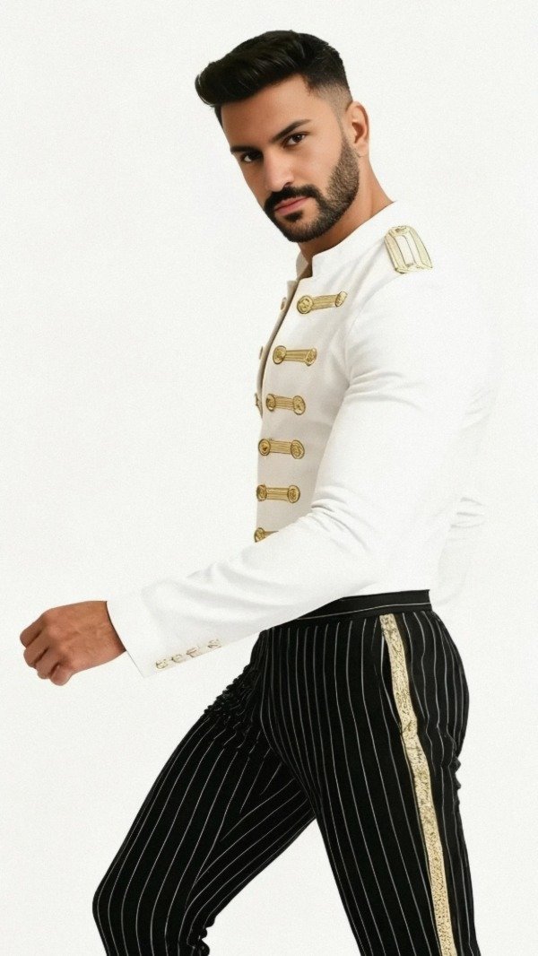 El diseño entallado en blanco radiante se realza con bordados y aplicaciones doradas de inspiración militar, cuidadosamente elaborados para aportar un aura de autoridad y sofisticación. Cada detalle está pensado para crear una silueta imponente, propia de un estilo que trasciende tendencias pasajeras.