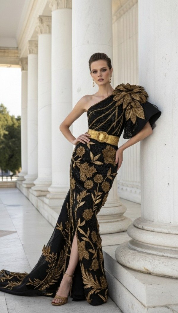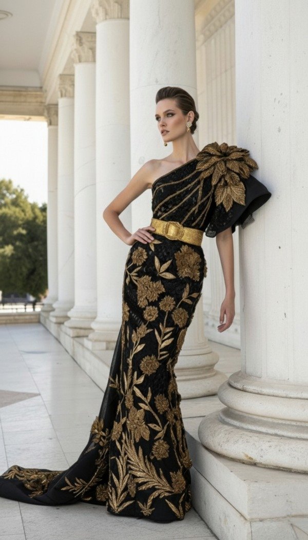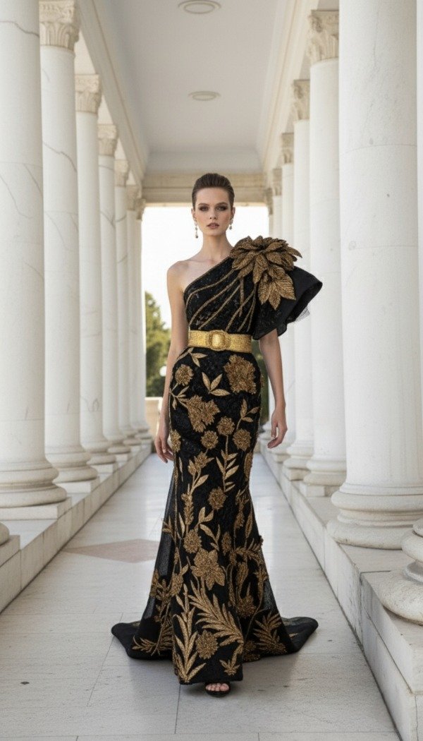 El vestido Aurora Imperial es una obra maestra de la alta costura, confeccionado en tul negro bordado con hilos dorados que evocan la majestuosidad de un jardín iluminado por la luz del sol naciente. Su diseño asimétrico, con un solo hombro adornado por una gran flor en relieve, transmite fuerza y elegancia, mientras que el cinturón metálico define con sutileza la silueta, creando un equilibrio perfecto entre poder y feminidad.
