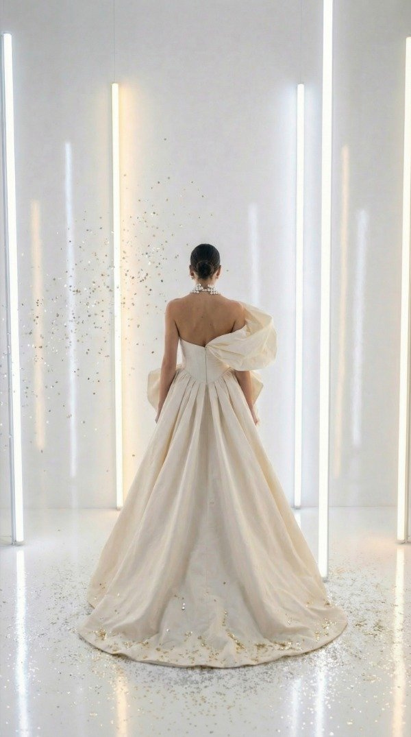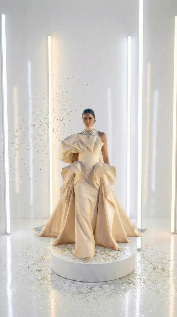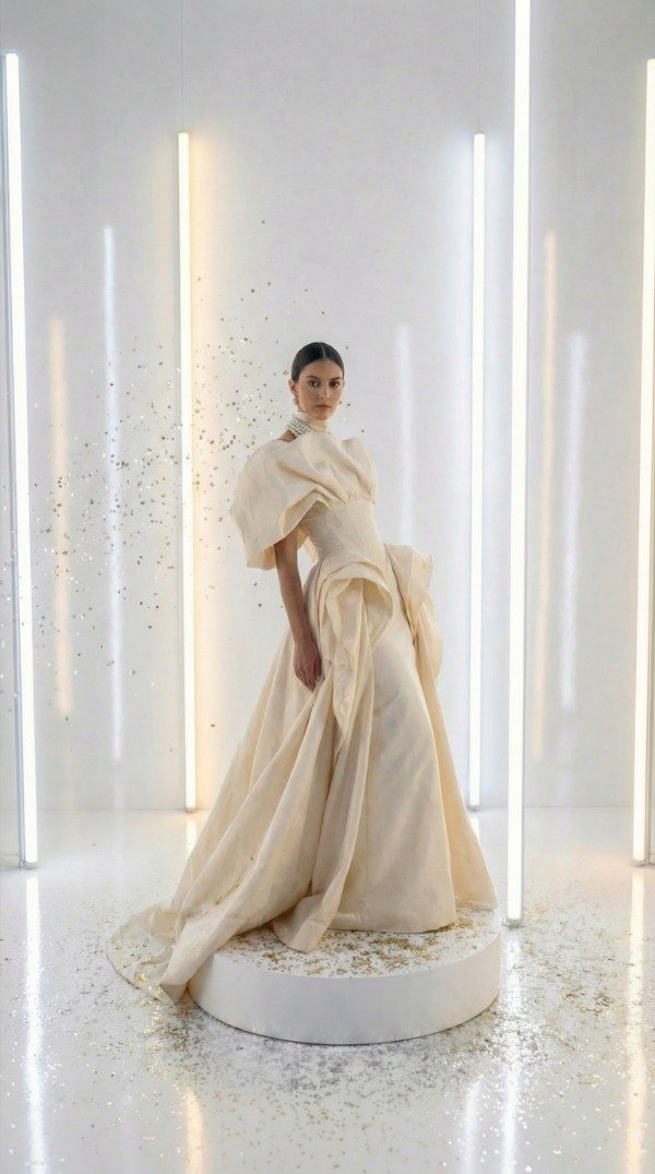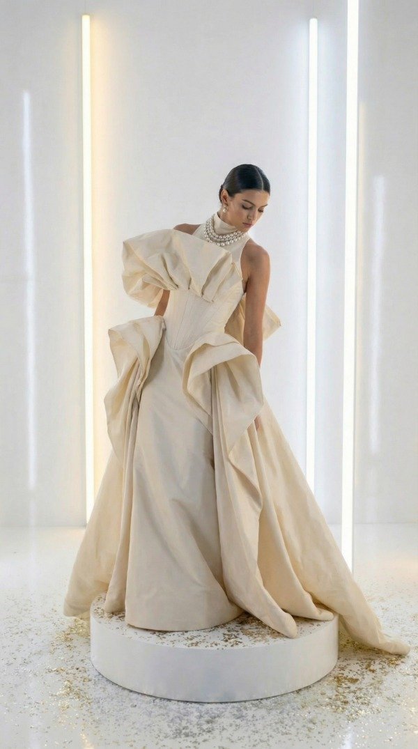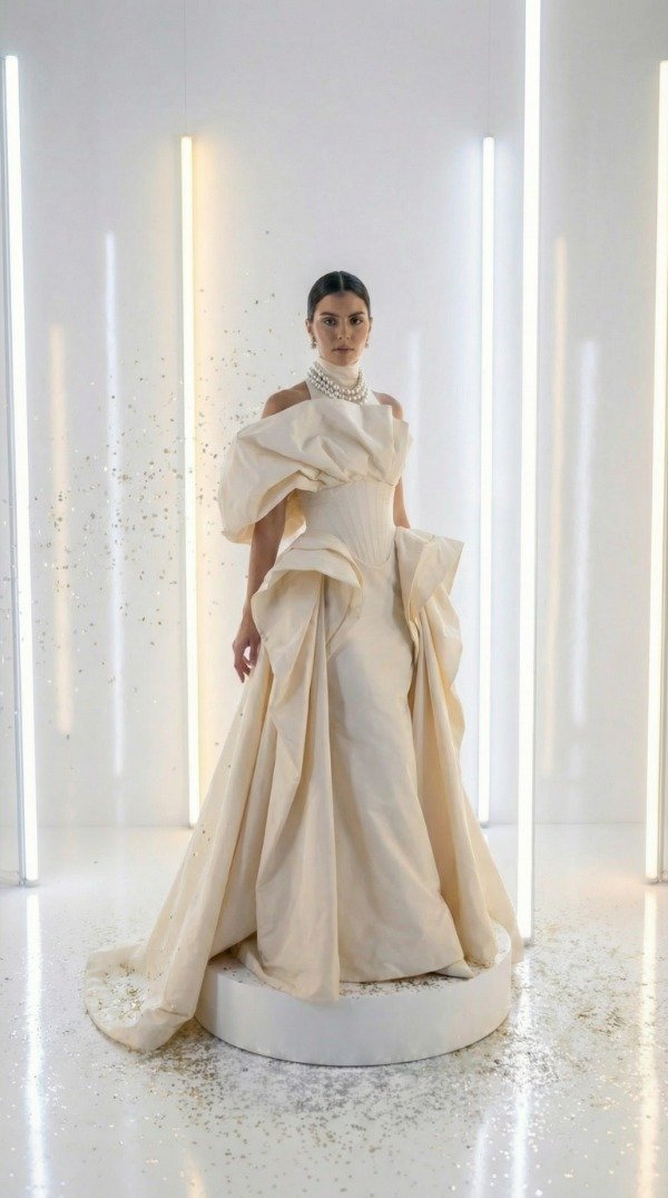 Eleva el concepto de gala a un nivel arquitectónico con esta pieza de impacto absoluto. Diseñado para ser el centro de todas las miradas, este vestido combina la rigidez de la corsetería clásica con la fluidez de volúmenes vanguardistas en un tono marfil que irradia luz propia.